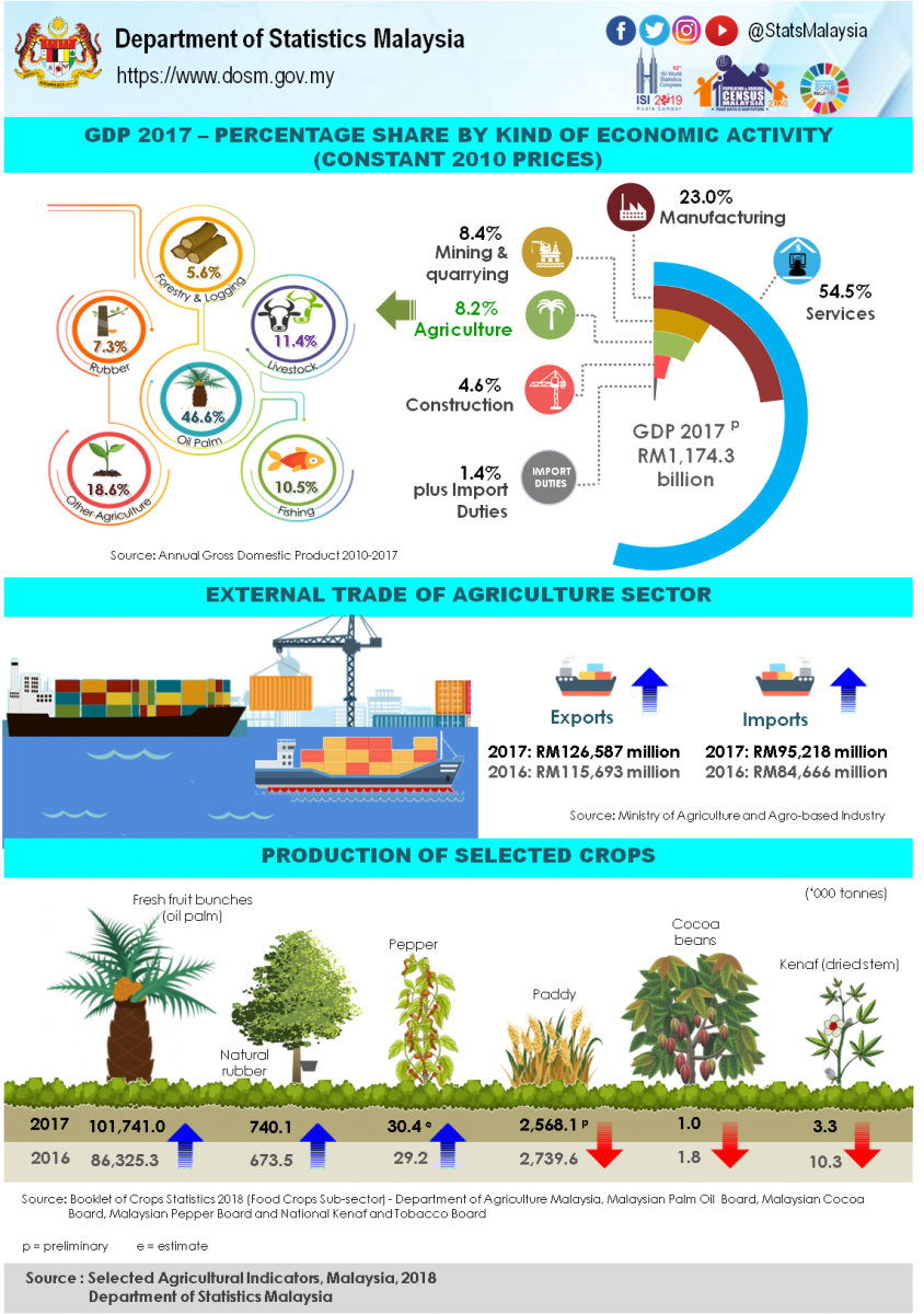 The agriculture sector contributed 8.2 per cent or RM96.0 billion to the Gross Domestic Product (GDP) in 2017. Oil palm was a major contributor to the GDP of agriculture sector at 46.6 per cent followed by other agriculture (18.6%), livestock (11.4%), fishing (10.5%), rubber (7.3%) and forestry & logging (5.6%).