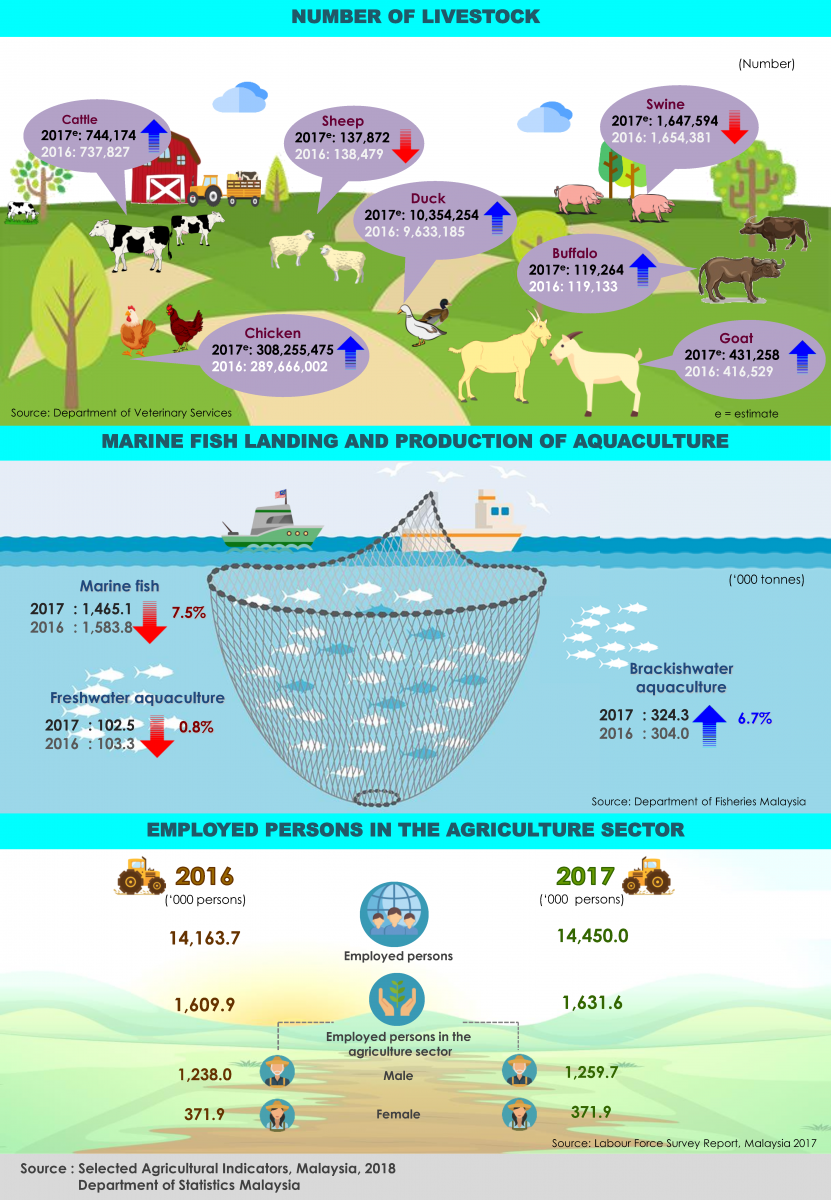 Selected Agricultural Indicators, Malaysia, 2018 contains statistics on economic performance, employment, domestic production and external trade for the agriculture sector. These statistics are presented in three main agriculture sub-sectors namely crops, livestock and fisheries.