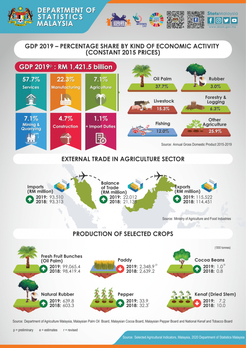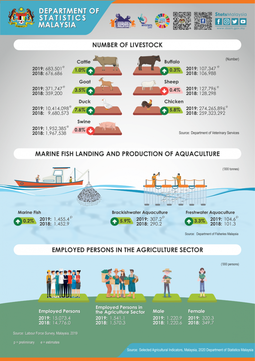 Selected Agricultural Indicators, Malaysia, 2020 comprised of statistics on economic performance, employment, domestic production and external trade in the agriculture sector. These statistics are presented in three main agriculture sub-sectors namely crops, livestock and fisheries.