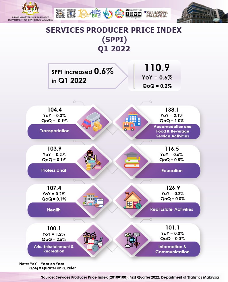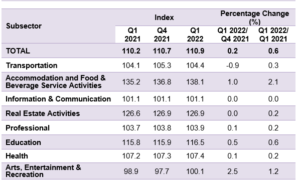 The Services Producer Price Index (SPPI) for the first quarter of 2022 increased 0.6 per cent to 110.9 as compared to 110.2 in the same quarter of the preceding year. The increase in the index was mainly driven by Accommodation and Food & Beverage Service Activities (2.1%), Arts, Entertainment & Recreation (1.2%), Education (0.6%) and Transportation (0.3%), while Real Estate Activities, Professional and Health increased 0.2 per cent respectively. However, the index for Information & Communication remained unchanged.