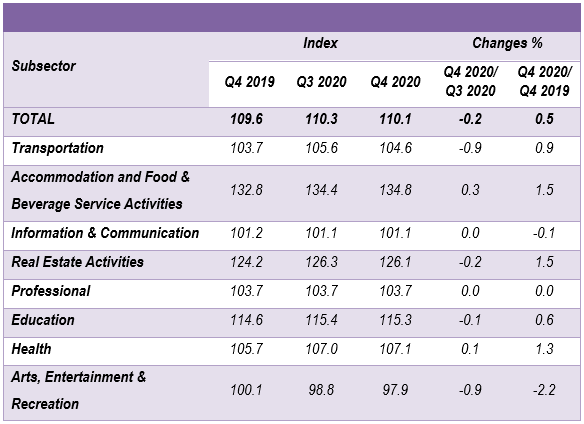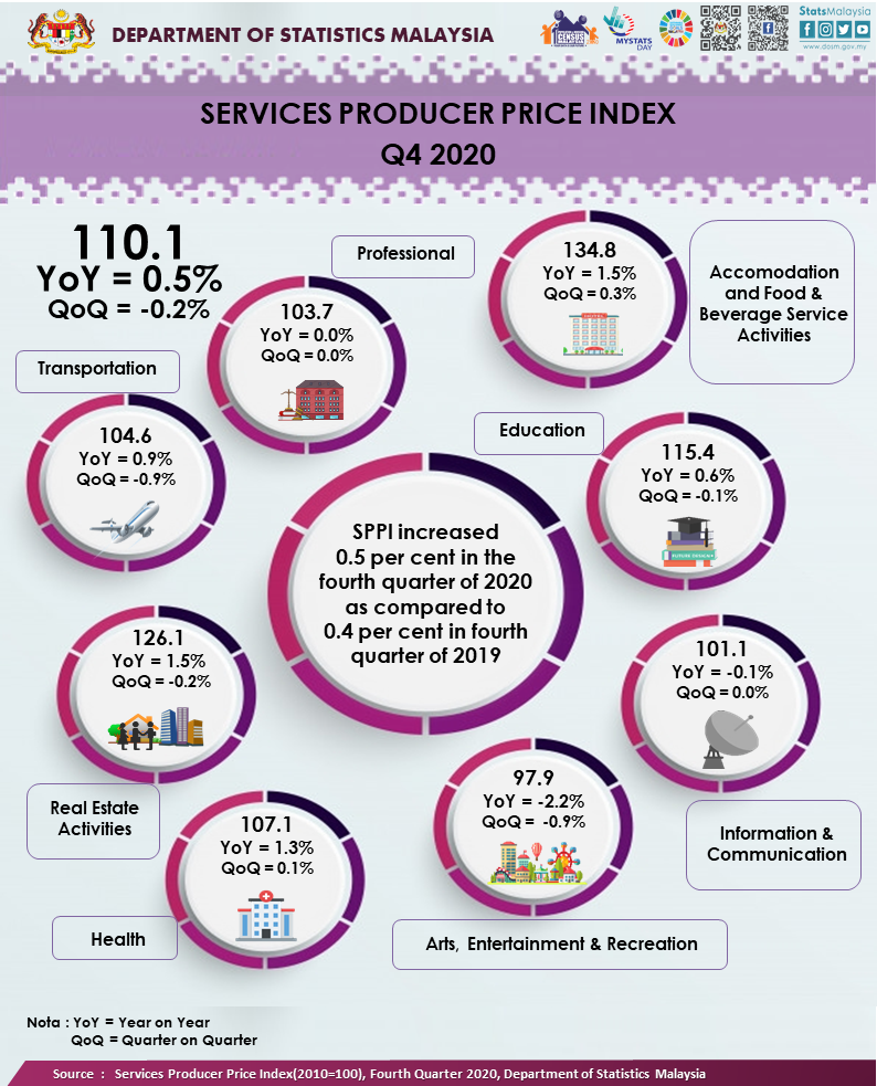 The Services Producer Price Index (SPPI) for the fourth quarter of 2020 increased 0.5 per cent to 110.1 as compared to 109.6 in the same quarter of the preceding year. The main sub-sectors that contributed to the increase were Accommodation and Food & Beverage Service Activities (1.5%), Real Estate Activities (1.5%), Health (1.3%), Transportation (0.9%), and Education (0.6%). However, the index for Arts, Entertainment & Recreation and Information & Communication decreased by 2.2 per cent and 0.1 per cent respectively. Index for Professional remained unchanged.