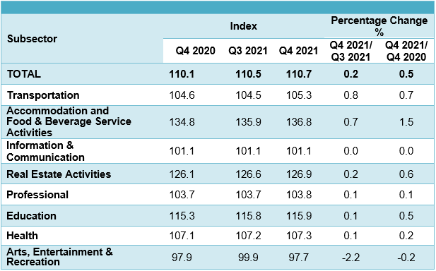 The Services Producer Price Index (SPPI) for the fourth quarter of 2021 increased 0.5 per cent to 110.7 as compared to 110.1 in the same quarter of the preceding year. The main sub-sectors that showed increases were Accommodation and Food & Beverage Service Activities (1.5%), Transportation (0.7%), Real Estate Activities (0.6%), Education (0.5%), Health (0.2%) and Professional (0.1%). However, the index for Arts, Entertainment & Recreation showed a decrease of 0.2 per cent. Index for Information & Communication remained unchanged.