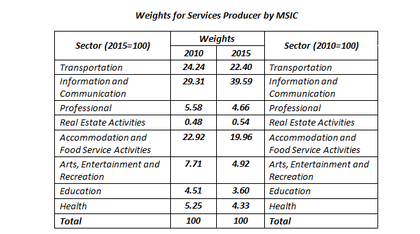 The item weights are assigned in proportion of their contributions to the total value of output in the economy. The weights by MSIC and sector are as follows: