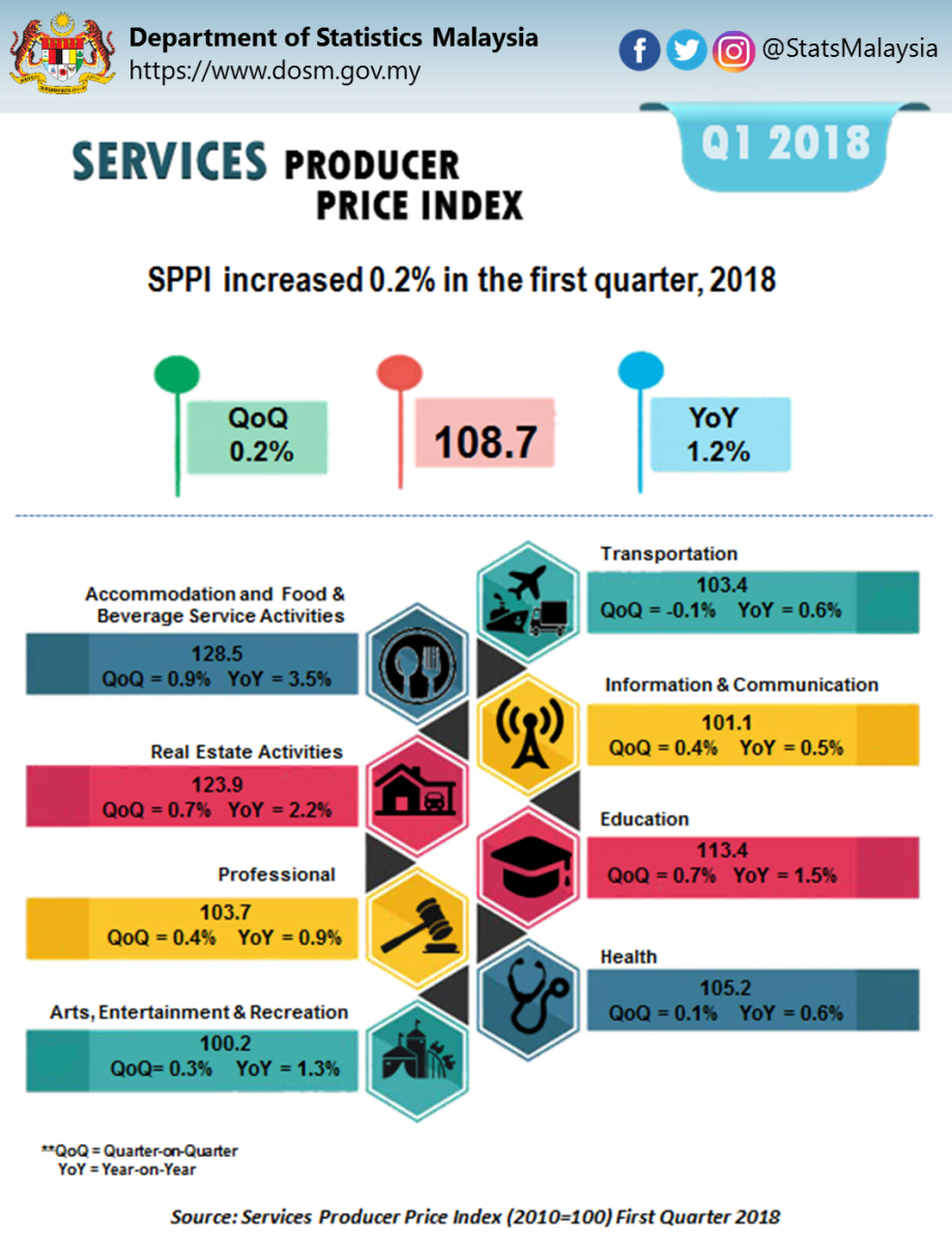 SPPI for the first quarter of 2018 registered an increase of 0.2 per cent compared to the previous quarter. The main sub-sectors that contributed were Accommodation and Food & Beverage Service Activities (+0.9%), Education and Real Estate Activities both increased 0.7 per cent.