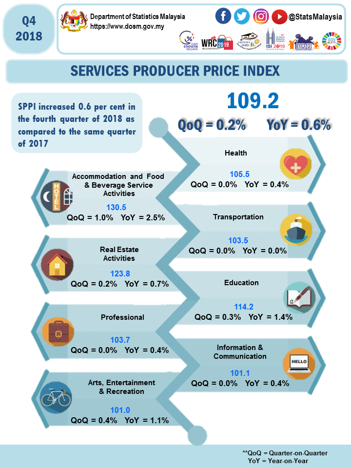 The Services Producer Price Index (SPPI) for the fourth quarter of 2018 increased 0.2 per cent as compared to the previous quarter. The main sub-sectors that registered increases were Accommodation & Food and Beverage Service Activities (+1.0%), Arts, Entertainment & Recreation (+0.4%), Education (+0.3%) and Real Estate Activities (+0.2%). Meanwhile, Transportation, Professional, Health and Information & Communication sub-sectors remain unchanged.