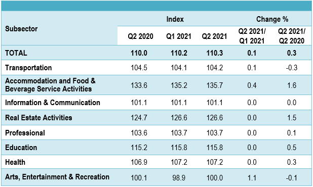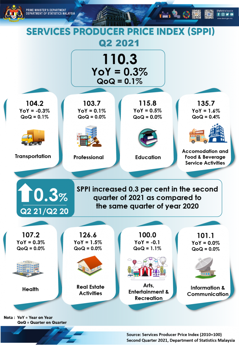 The Services Producer Price Index (SPPI) for the second quarter of 2021 increased 0.3 per cent to 110.3 as compared to 110.0 in the same quarter of the preceding year. The main sub-sectors that showed an increase were Accommodation and Food & Beverage Service Activities (1.6%), Real Estate Activities (1.5%), Education (0.5%), Health (0.3%) and Professional (0.1%). However, the index for Transportation and Arts, Entertainment & Recreation decreased by 0.3 per cent and 0.1 per cent respectively. Index for Information & Communication remained unchanged.