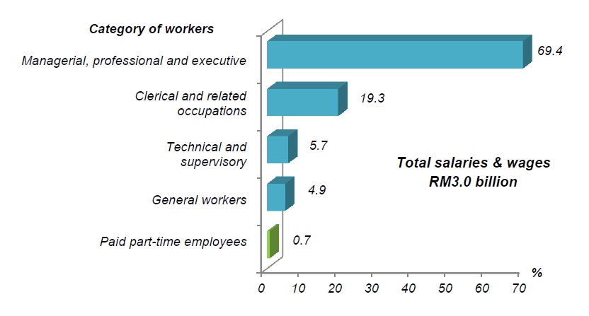 Total salaries & wages paid in 2014 stood at RM3.0 billion of which the managerial, professional and executive was the highest with RM2.1 billion (69.4%). This was followed by clerical and related occupations (19.3%), technical and supervisory (5.7%), general workers (4.9%) and paid part-time employees (0.7%) as potrayed in Chart 4.