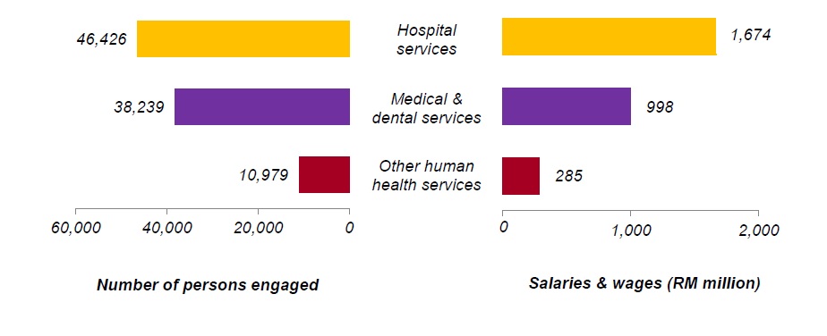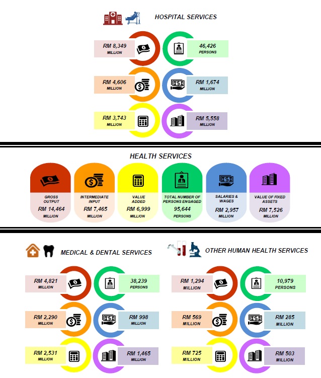 Value added showed the same structure as gross output where hospital services was the highest contributor with RM3.7 billion (53.5%) of total value added. This was followed by medical & dental services which recorded RM2.5 billion (36.1%) and other human health services registering RM0.7 billion (10.4%) as illustrated in Chart 1.
