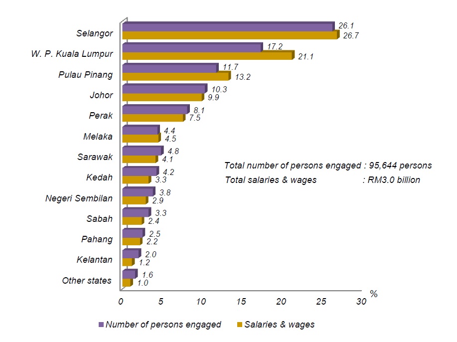 These three states also dominated the total number of persons engaged in this services in 2014 with 52,588 persons (55.0%). The highest number of persons engaged was 24,983 persons (26.1%) in Selangor followed by W.P. Kuala Lumpur of 16,446 persons (17.2%) and Pulau Pinang of 11,159 persons (11.7%). In tandem with the number of persons engaged, Selangor also contributed the highest salaries & wages paid of RM789.3 million (26.7%) followed by W.P. Kuala Lumpur and Pulau Pinang with RM623.4 million (21.1%) and RM389.9 million (13.2%) respectively as in Chart 7.