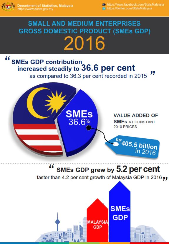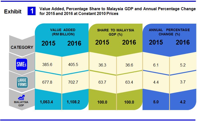 In 2016, value added of SMEs at constant 2010 prices was RM405.5 billion (2015: RM385.6 billion). In nominal terms, SMEs GDP registered a value of RM463.2 billion, an increment of RM34.2 billion compared to 2015.