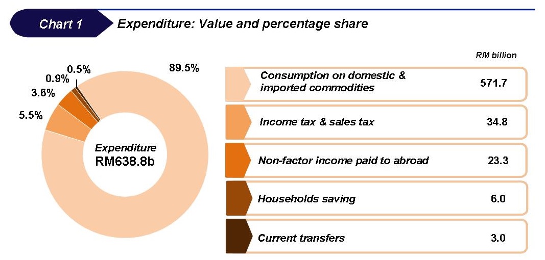 Consumption on domestic & imported commodities was the largest expenditure for households with a value of RM571.7 billion (89.5%). The total income tax & sales tax paid by households was RM34.8 billion (5.5%) and the non-factor income paid to abroad was RM23.3 billion (3.6%) as shown in Chart 1.