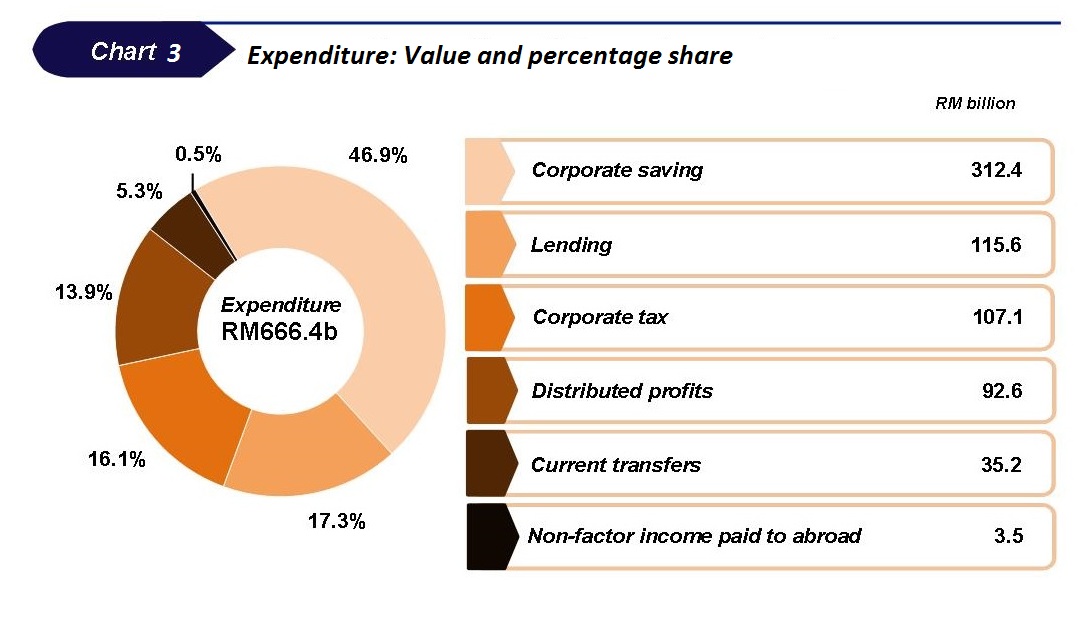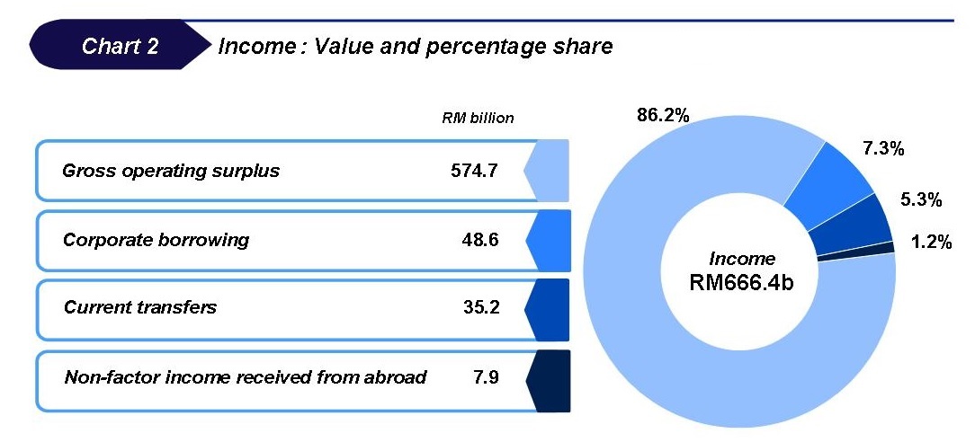 Total income of financial & non-financial corporations amounted to RM666.4 billion with a major share of 86.2 per cent (RM574.7 billion) contributed by gross operating surplus followed by corporate borrowing 7.3 per cent (RM48.6 billion) and current transfers 5.3 per cent (RM35.2 billion) as depicted in Chart 2.