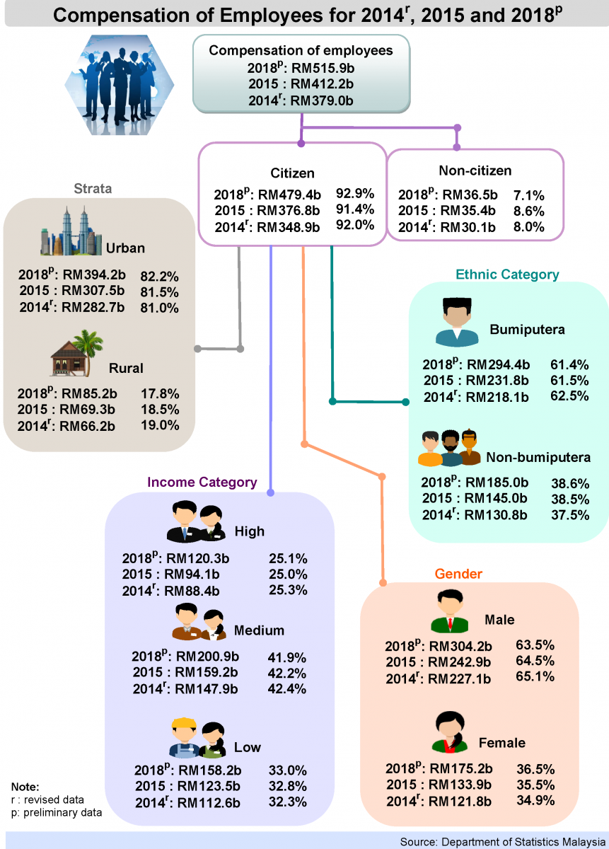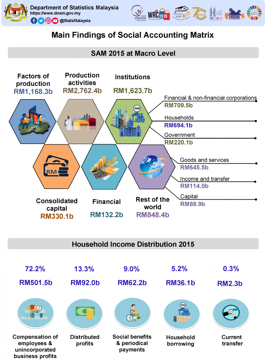 Social Accounting Matrix 2015 publication also includes the revised compensation of employee for 2014 and the 2018 preliminary data for compensation of employee and income taxes. More information on the Social Accounting Matrix can be obtained from the DOSM website at www.dosm.gov.my.