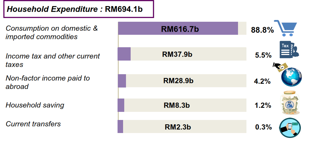 Meanwhile, consumption on domestic & imported commodities was the main expenditure for households amounted RM616.7 billion (88.8%). Total income tax & other current taxes paid by households was RM37.9 billion (5.5%) and non-factor income paid to abroad was RM28.9 billion (4.2%).
