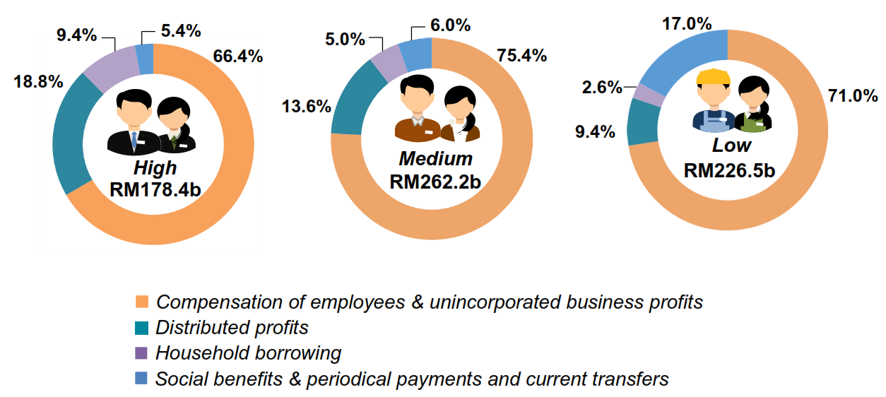 Compensation of employees & unincorporated business profits was the main income for households in all categories of income. Distributed profits was the second largest income received by high income category and medium income category with a share of 18.8 per cent and 13.6 per cent respectively. Meanwhile, low income category received higher social benefits & periodical payments and current transfer 17.0 per cent as compared with high income category 5.4 per cent and medium income category 6.0 per cent.