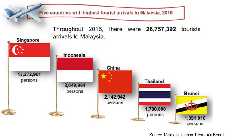 Tourist arrivals to Malaysia in 2016 increased to 4.0 per cent from 25,721,251 persons (2015) to 26,757,392 persons (2016). In 2016, the highest percentage of tourists were from Singapore (13,272,961 persons). This was followed by tourists from Indonesia (3,049,964 persons) and China (2,142,942 persons).