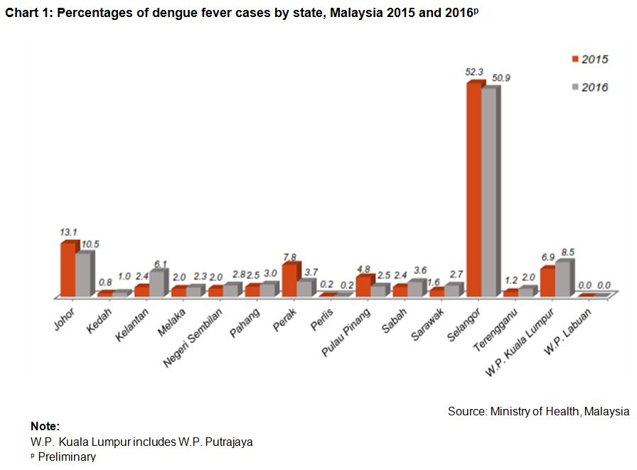 In 2016, Selangor recorded the highest dengue fever of 50.9 per cent with a decrease of 1.4 per cent as compared to 2015. Besides that, three states also recorded a decrease in dengue fever cases i.e. Johor (10.5%), Perak (3.7%) and Pulau Pinang (2.5%).