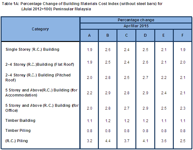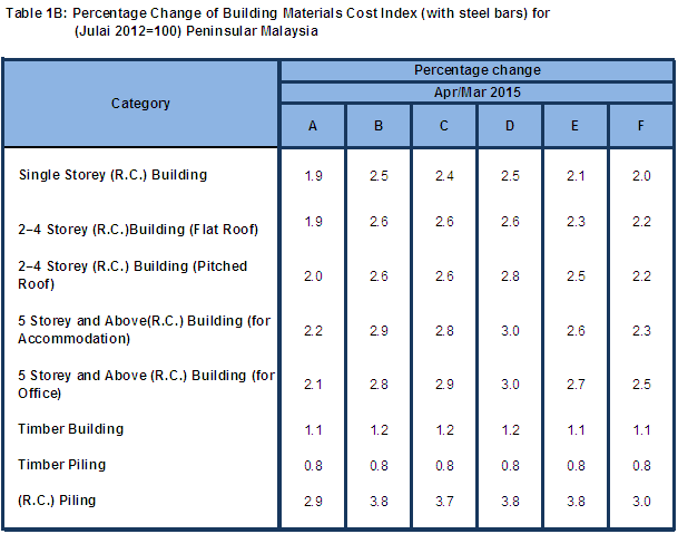 The Building Material Cost Index (BCI) (without steel bars and with steel bars) for all building categories of Peninsular Malaysia showed increases in April 2015 as compared to the previous month.