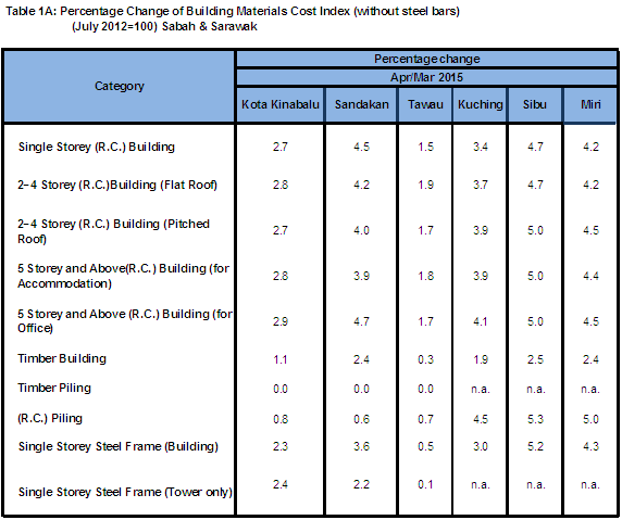 Overall, the Building Material Cost Index (BCI) (without steel bars and with steel bars) for all building categories in Sabah recorded increases compared to the previous month except for (R.C.) piling building (with steel bars) in Tawau which showed a decrease of 0.7 per cent.
