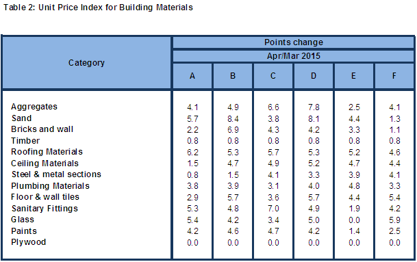 The unit price index of building materials recorded increases in all regions as compared to the previous month except for plywood which remained unchanged in all regions.
