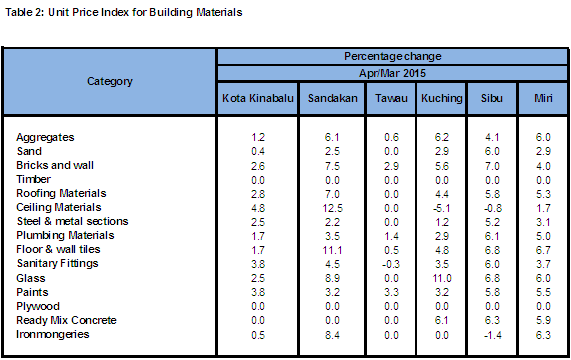 The unit price index of construction materials that showed changes in Sarawak were ceiling materials in Kuching and Sibu which decreased by 5.1 and 0.8 points respectively meanwhile unit price index for ironmongeries in Sibu showed a decrease of 1.4 points.