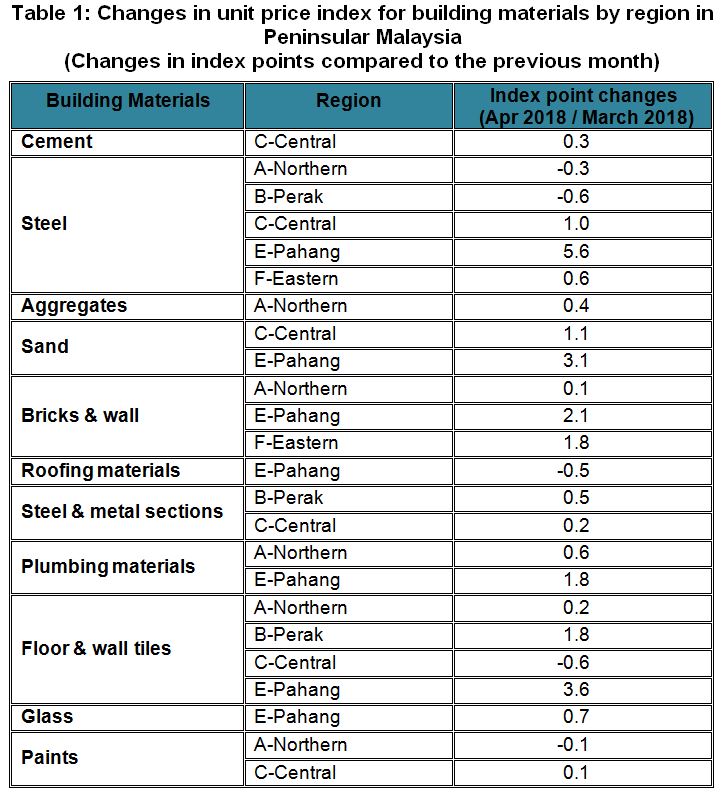 The Building Material Cost Index (BCI) (without steel bars) for several category of building in almost all regions showed increases in April 2018 except region D-Johor which was unchanged as compared to March 2018.