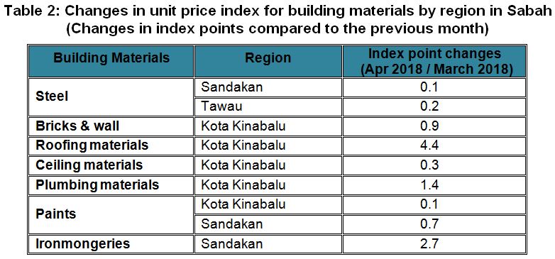 The Building Material Cost Index (BCI) (without steel bars and with steel bars) in Sabah showed increases for almost all building categories in April 2018 except the BCI in Tawau which was unchanged as compared to the previous month.
