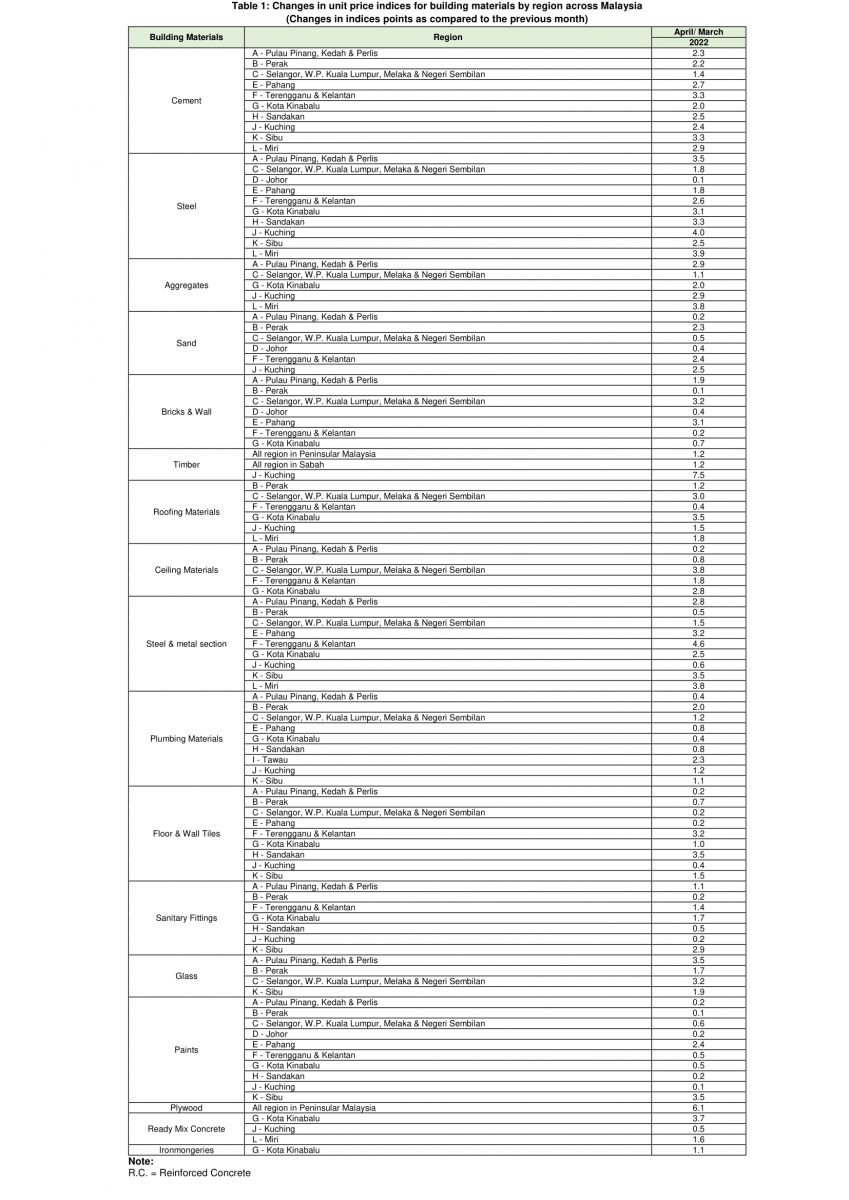 The BCI with steel bars for all region in Peninsular Malaysia, Sabah and Sarawak increased between 0.1 and 3.6 per cent for almost all building categories. Building categories that recorded the highest increase in Peninsular Malaysia was 2-4 Storey (R.C.) Building (Flat Roof) and 5 Storey and Above (R.C.) Building (For Office) in Pulau Pinang, Kedah, Perlis, Terengganu and Kelantan with 3.1 per cent, Kota Kinabalu in Sabah with 2.4 per cent for Single Storey Steel Frame (Tower only) and Timber Building in Kuching Sarawak with 3.6 per cent.