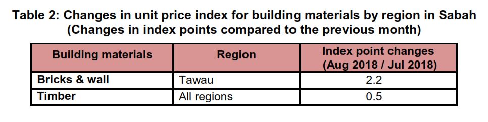 The changes in unit price indices of building materials by region in Sabah are shown in Table 2.