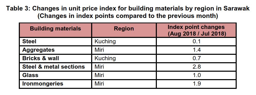 The Building Material Cost Index (BCI) (without steel bars and with steel bars) for almost all categories of building in Kuching and Miri increased in August 2018. Meanwhile, the BCI in Sibu was unchanged as compared to the previous month.