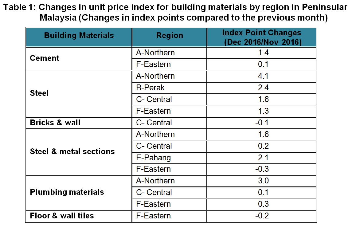 The Building Material Cost Index (BCI) (without steel bars) for several categories of building in regions A-Northern and E-Pahang showed increases in December 2016. The BCI for 5 storey and above (R.C.) building (for accommodation) in region C-Central also showed an increase of 0.1 per cent. Meanwhile, the BCI for all categories of building in regions B-Perak, D-Johor and F-Eastern showed no change as compared to the previous month.