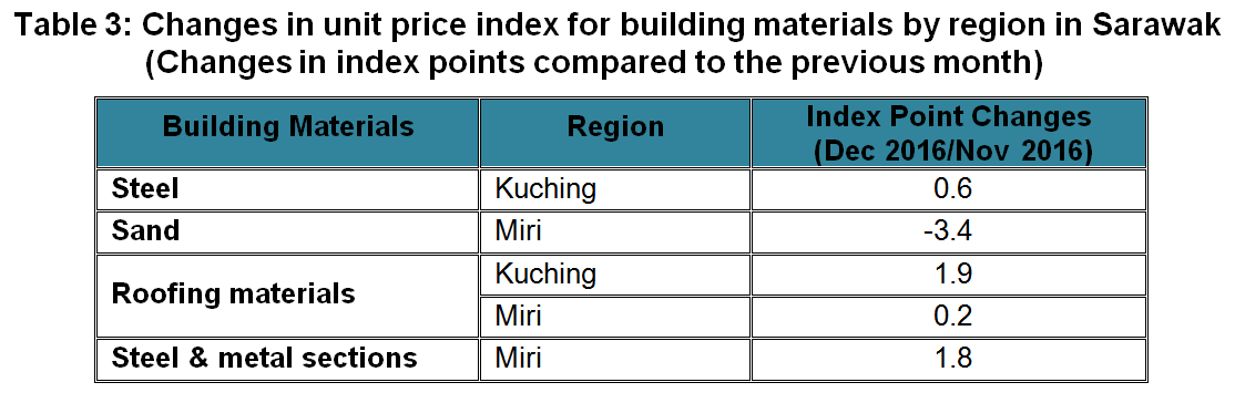 The Building Material Cost Index (BCI) (without steel bars and with steel bars) in Kuching and Miri showed increases for almost all categories of buildings in December 2016. In contrast, the BCI in Sibu remained unchanged as compared to the previous month.
