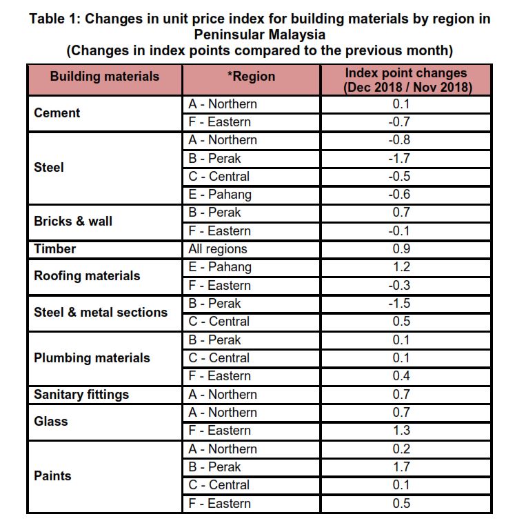 The BCI (with steel bars) in region D-Johor and E-Pahang increased between 0.1 and 1.0 per cent in December 2018. In contrast, the BCI in region A-Northern, B-Perak, C-Central and F-Eastern showed decreases except for Timber building and Timber piling, increased between 0.9 and 1.0 per cent respectively as compared to the previous month.