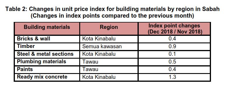 The changes in unit price indices of building materials by region in Sabah are shown in Table 2.