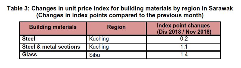 The changes in unit price indices of building materials by region in Sarawak are shown in Table 3.