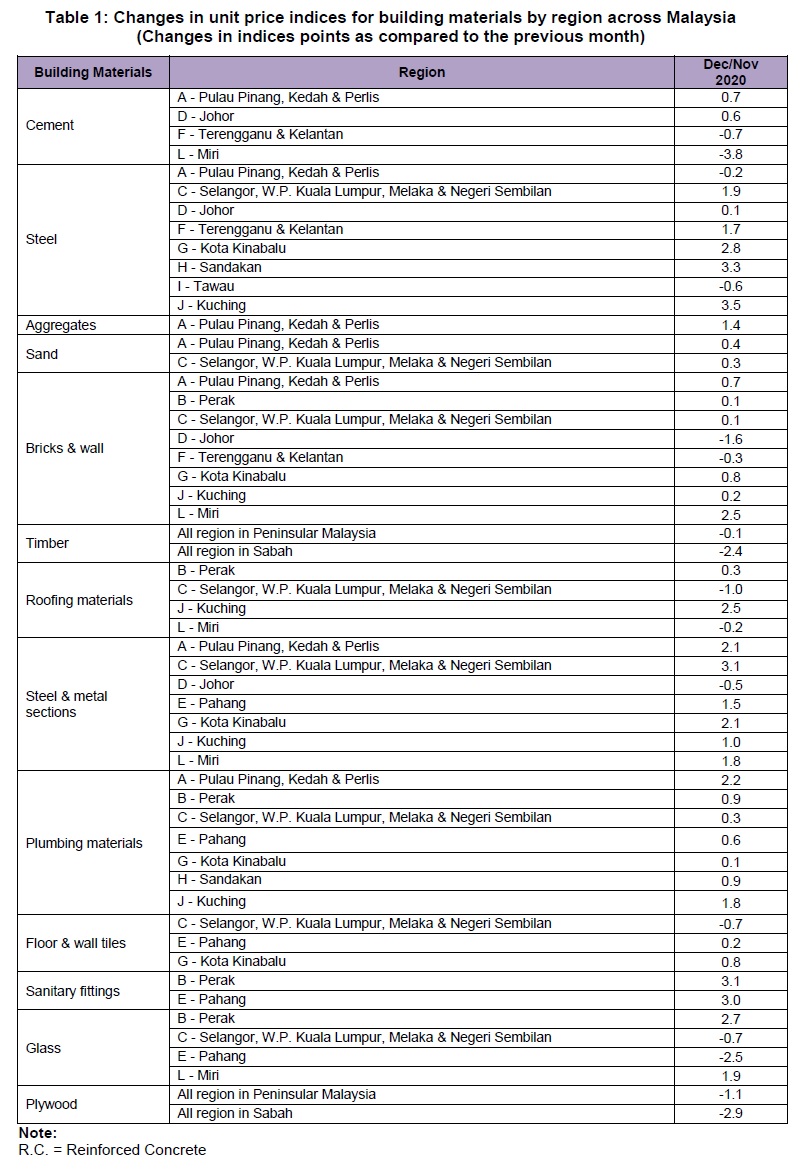 The changes in unit price indices of building materials by region across Malaysia are shown in Table 1.