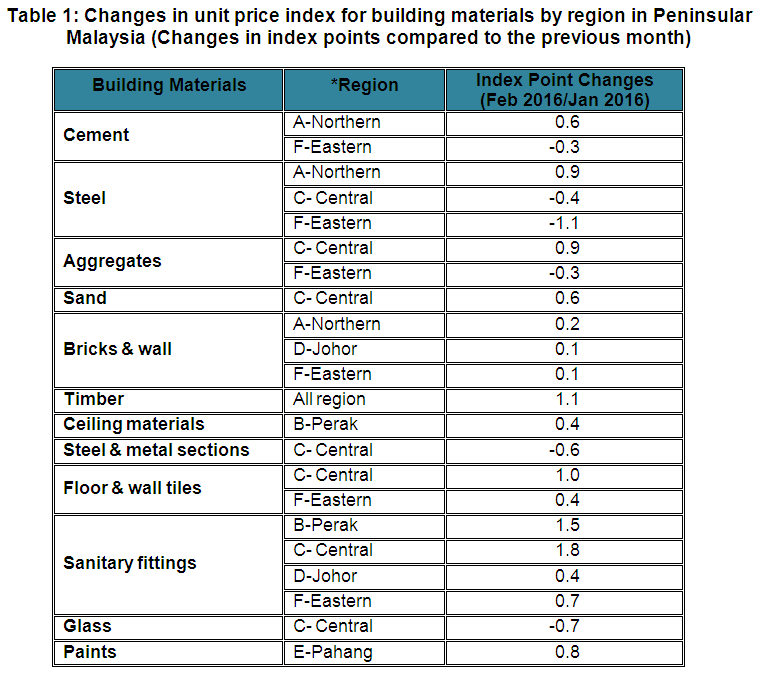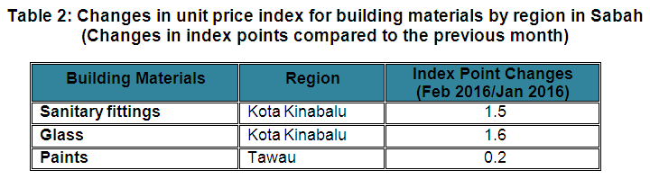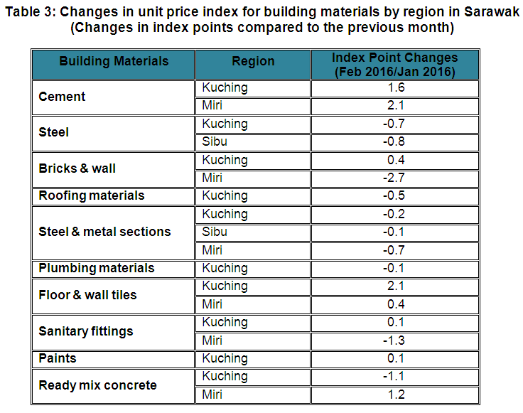The Building Material Cost Index (BCI) (without steel bars) for almost all building categories in Kuching and several categories in Miri showed decreases in February 2016 compared to the previous month. Meanwhile, the BCI in Sibu for all building categories unchanged in February 2016 as compared to January 2016.