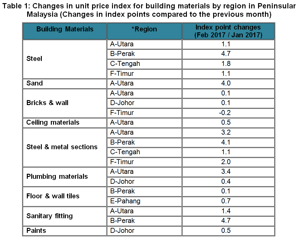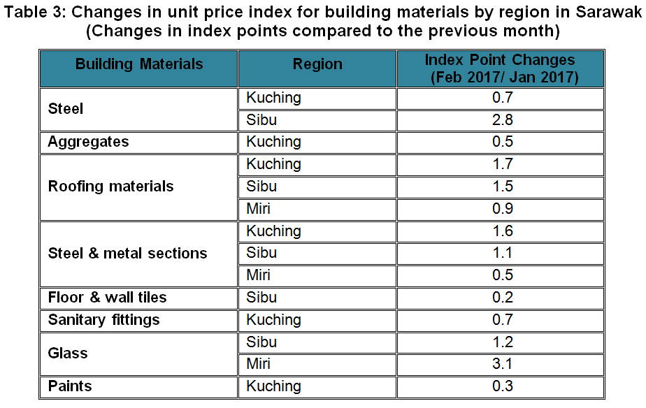 The BCI (with steel bars) in Kota Kinabalu and Tawau recorded increases for almost all categories of building in February 2017 as compared to the previous month. While, the BCI in Sandakan remained unchanged as compared to January 2017.