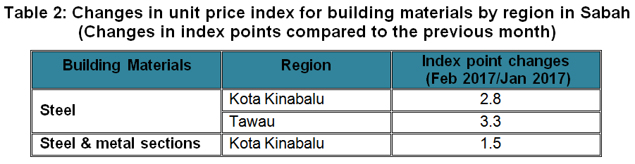 The Building Material Cost Index (BCI) (without steel bars) in Kota Kinabalu recorded increases for single storey steel frame (building) and single storey steel frame (tower only) in February 2017. While, the BCI in Sandakan and Tawau remained unchanged as compared to the previous month.
