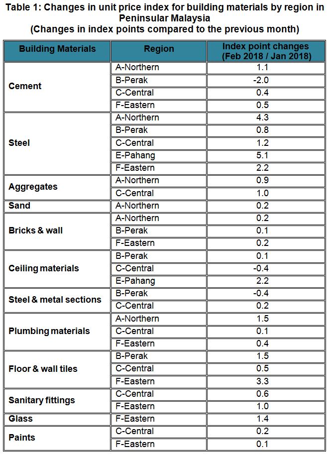 The Building Material Cost Index (BCI) (without steel bars and with steel bars) showed increases for almost all regions in February 2018 except region B-Perak which showed decreases as compared to the previous month. Meanwhile, the BCI in region D-Johor remained unchange as compared to January 2018.