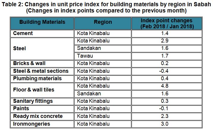 The Building Material Cost Index (BCI) (without steel bars and with steel bars) in Sabah recorded increases for almost all building categories except single storey steel frame (tower only) in Kota Kinabalu which showed decreases in February 2018 as compared to the previous month.