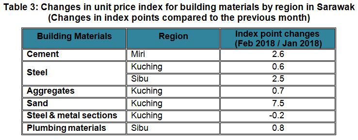 The changes in the unit price indices for building materials by region in Sarawak are as follows: