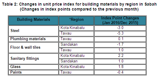 Changes in unit price index for building materials by region in Sabah are as follows: