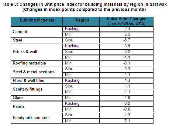 Changes in unit price index for building materials by region in Sarawak are as follows: