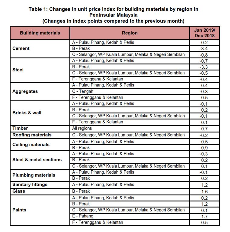 The Building Material Cost Index (BCI) (without steel bars) for all categories of building in region A (Pulau Pinang, Kedah & Perlis), D (Johor), E (Pahang) and F (Terengganu & Kelantan) increased between 0.1 and 1.7 per cent in January 2019 as compared to the previous month. In contrast, the BCI in region B (Perak) and C (Selangor, WP Kuala Lumpur, Melaka & Negeri Sembilan) decreased between 0.1 and 1.5 per cent except for Timber building and Timber piling, increased by 0.6 and 0.7 per cent each.