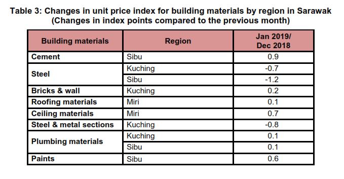 The changes in unit price indices of building materials by region in Sarawak are shown in Table 3.