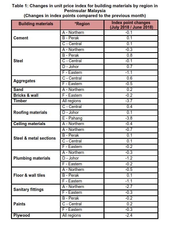 The Building Material Cost Index (BCI) (without steel bars and with steel bars) for almost all categories of building in all regions showed increases in July 2018 as compared to June 2018. However, the BCI (with steel bars) in Perak for 5 storey and above building (for accommodation) and 5 storey and above building (for office) increased 0.1 per cent respectively as compared to the previous month.