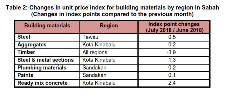 The Building Material Cost Index (BCI) (without steel bars and with steel bars) in all regions showed decreases for almost all categories of building in July 2018 as compared to June 2018. However, the BCI (with steel bars) for R.C piling in Kota Kinabalu and Tawau; single storey steel frame (building) in Kota Kinabalu; and single storey steel frame (tower only) in Kota Kinabalu increased as compared to the previous month.