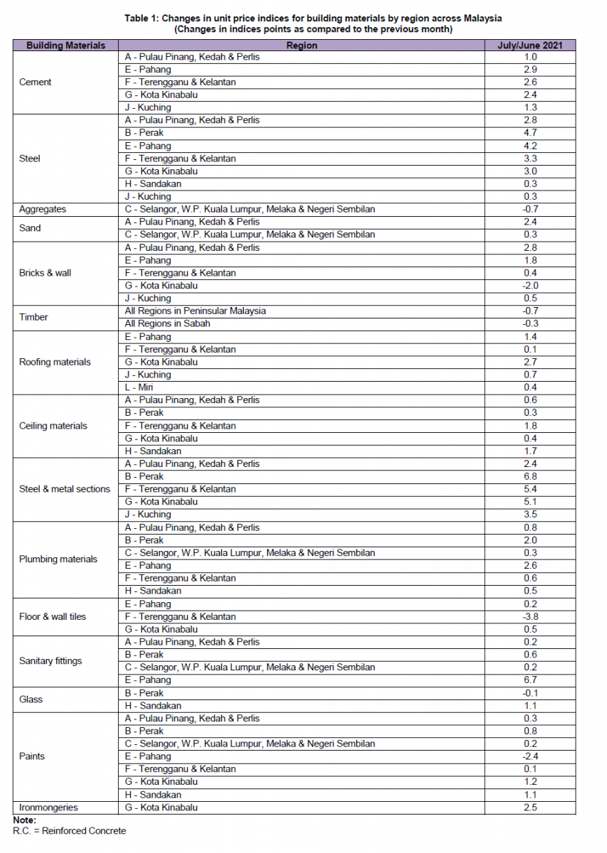 The BCI with steel bars in July 2021 as compared to preceding month for almost all regions in Peninsular Malaysia increased between 1.3 and 3.0 per cent for almost all building categories. However, region C (Selangor, W.P. Kuala Lumpur, Melaka & Negeri Sembilan) and D (Johor) registered a decline between 0.1 and 0.7 per cent for almost all categories of building.
