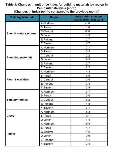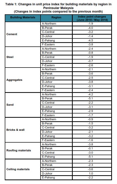The Building Material Cost Index (BCI) (without steel bars and with steel bars) for almost all categories of building in all regions decreased in June 2018 as compared to May 2018 except for timber piling remained unchange as compared to the previous month.